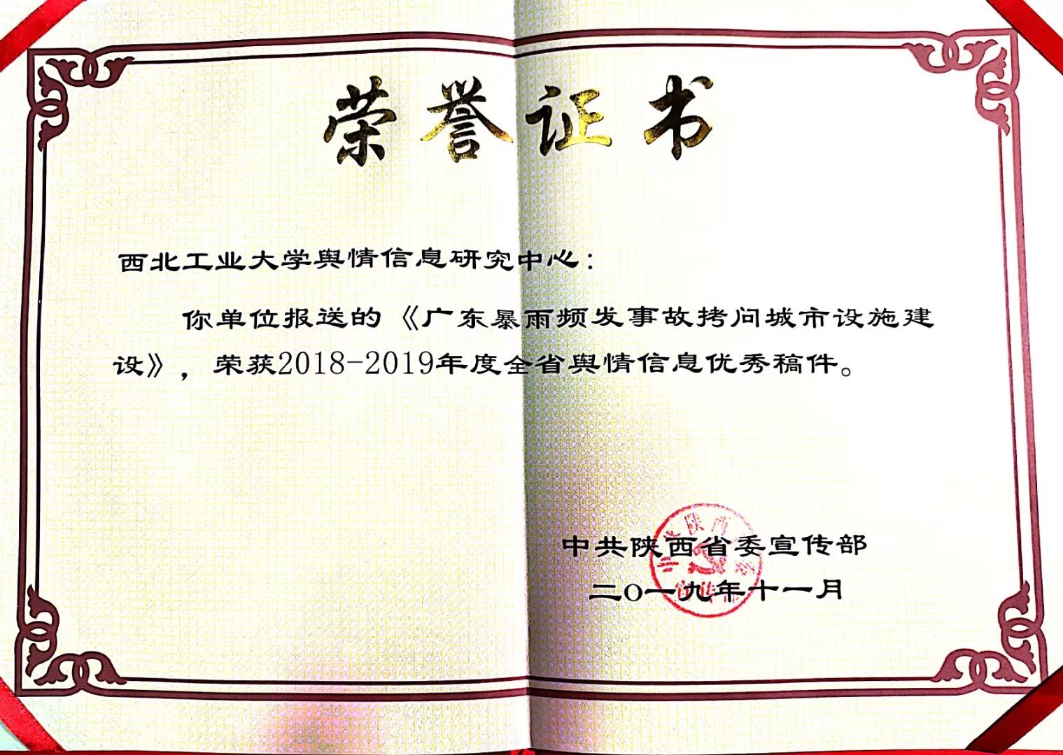 陕西省重点舆情信息研究中心被评为2018-2019年度全省舆情信息工作先进单位、中心副主任贺苗被评为省级先进个人,她撰写的舆情稿件《广东暴雨频发事故拷问城市设施建设》被评为优秀稿件(全省共30篇),并代表中心进行《着力“四个到位”模式 凝聚舆情工作共识》的主题发言。