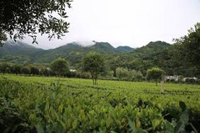 这里依山傍水,在政府指导帮助下,当地居民将老房改造成了整齐划一的徽派民居,山环水绕,形如游龙,故而得名“龙头村”。该村位于烟波浩渺的古仙湖下游,丘陵山脉委婉起伏,清澈的河流环村围绕,刚刚进入,就能看到成片的茶树从脚下一直绵延到尽头的远山。实践队从县城出发,抵达时正赶上雨后,山头可见层层云雾缭绕,空气也格外清新。