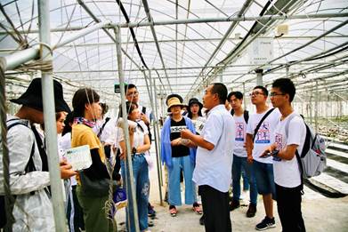 图为金米村村支书为实践队队员们讲解木耳种植及智能大棚运转情况
