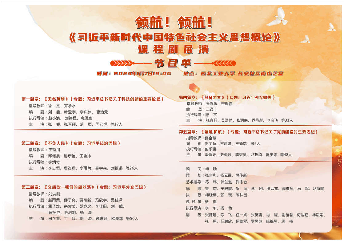思政课教师通过指导随堂上课的学生精心打磨剧本,融情于景,寓教于剧,在剧中体验时代变迁,感悟信仰力量,将家国情怀、科学家精神、“总师育人文化”等精神文化融入剧本创作中,让学生更加深刻地学习领悟习近平新时代中国特色社会主义思想和党的二十大精神。