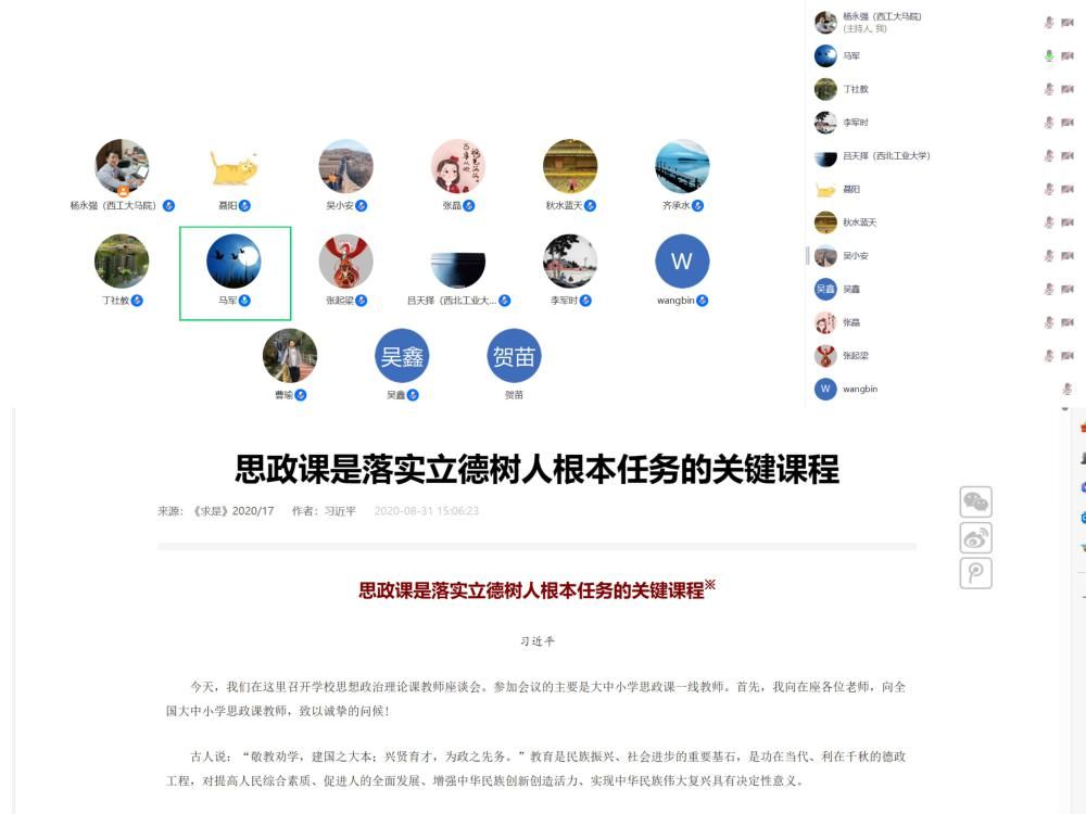 中国近现代史基本问题研究系于3月15日晚,通过线上与线下相结合的形式组织召开“习近平总书记思想政治理论课教师座谈会五周年”主题集体备课会。会议由系主任汪永平主持。会上,教学主任房小捷通报了学校和学院关于建设“育人文科”、实现院内外资源联动打造“大思政”格局、进一步做好思政课改革创新的要求和部署。接着,教师代表赵海霞从“以研促教”、“教学相长”、发挥教师主导和学生主体有机结合、充分利用学校及陕西丰富资源四个方面,做了如何贯彻落实习近平总书记“八个相统一”要求的报告。2023年陕西省思政课大练兵“教学能手”房小捷进行教学展示。随后,全体参会人员根据学校和学院的各项指导意见,围绕如何进一步实现“八个相统一”要求,不断加强“总师育人文化”引领作用,结合《中国近现代史纲要》课程教学改革进行了深入讨论,就教学案例库建设、教学环节改进、筹设小班研讨课、线上课程推进、提高备课会实效、教学改革课题申报、数字化课程资源建设形成了今后一段时间的具体工作计划和保障落实措施。