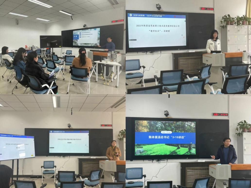 德法与形势政策系于3月18日下午,通过线上与线下相结合的形式组织召开了集体备课会。备课会由系主任胡建发主持。首先,2023年陕西省思政课大练兵“教学标兵”赵媛媛向参会老师作参赛经验分享。她表示要善用“大思政课”,将课程与学生实际相结合,以理说服人、以实取信人、以言吸引人,让课程更有生命力。随后,在优秀思政课教师教学经验分享环节,柴岳春副教授讲述了如何讲出逻辑清晰、理论深刻、案例精良、教法灵活的课程。她强调了教学方法、案例选择的重要性,并鼓励青年老师积极参加以赛促教。李秀萍副教授谈到了思政课教学目前存在的一些困难,如离不开教材、完全抛开教材、传统课堂模式僵化等,需要拓宽课堂阵地,强调了学生在教学过程中的主体地位。接着,胡建发介绍了骆郁廷教授在西安交通大学的报告,并谈了习近平总书记学校思想政治理论课教师座谈会重要讲话重温体会。最后,胡建发通报本科教育教学评估整改情况,集体探讨了人才培养、教学方法以及备课形式等方面的相关问题及改进措施。
