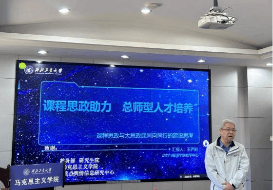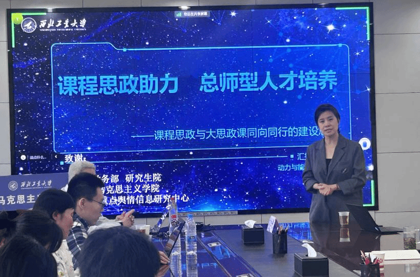 思政课程和课程思政协同育人的举措做了简要介绍,着重强调了课程思政与思政课程同向同行,将 “总师育人文化”融入思政课堂的重要性,动员各位思政课教师积极研讨交流,与理工科教师共同探讨课程交叉融合,不断推进“大思政课”建设深层次发展,打造学生喜闻乐见的思政课堂。