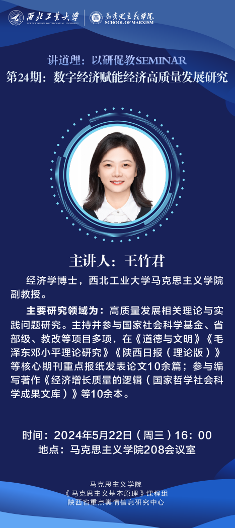 马克思主义基本原理系在院楼208会议室举办第24期“讲道理——以研促教Seminar”。本期主题为《数字经济赋能经济高质量发展研究》,马克思主义基本原理系王竹君副教授做主题分享。
