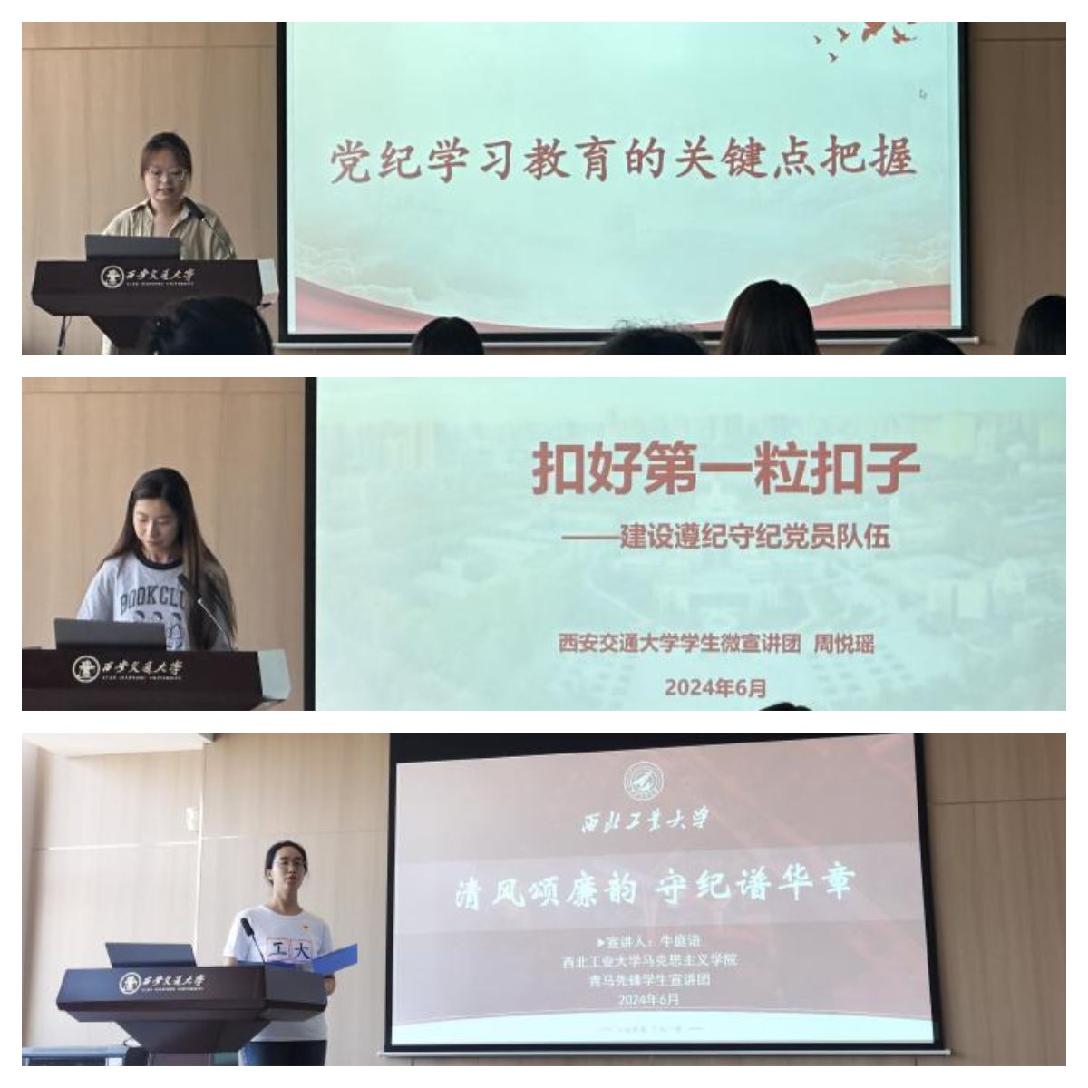 活动伊始,三校学生党员们集体联学新修订《中国共产党纪律处分条例》。西北农林科技大学人文社会发展学院郭白雪同学从关键点把握、西农建设和廉政教育的人文特色实践三个方面为大家介绍了西北农林科技大学在党纪学习教育上的具体实践;西安交通大学学生微宣讲团周悦瑶同学为大家带来了《扣好第一粒扣子——建设遵纪守纪党员队伍》的宣讲,通过多个代表性案例呈现中央八项规定精神于点滴之间激浊扬清,充分反映了全面从严治党永远在路上;调教漫画