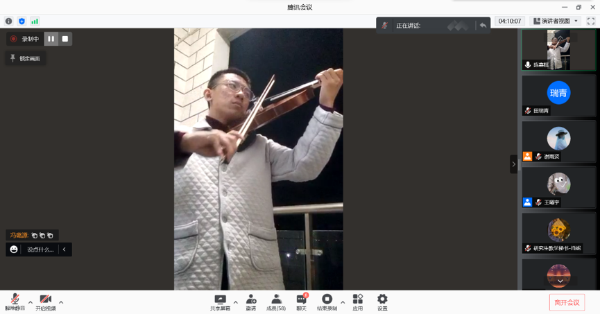 之后,李刚老师为大家带来了摇滚乐《梦回唐朝》,女儿一一作为马院的一份子也积极献上自己为西安抗疫编排的一段手势舞。表演完毕,师生一起连线在抗疫前线值守的李水、田瑞青、李树炜、李燕南、刘思源、李仲轩等同学,他们认真为同学们服务、敢于迎难而上,展示了青马先锋的奉献精神。