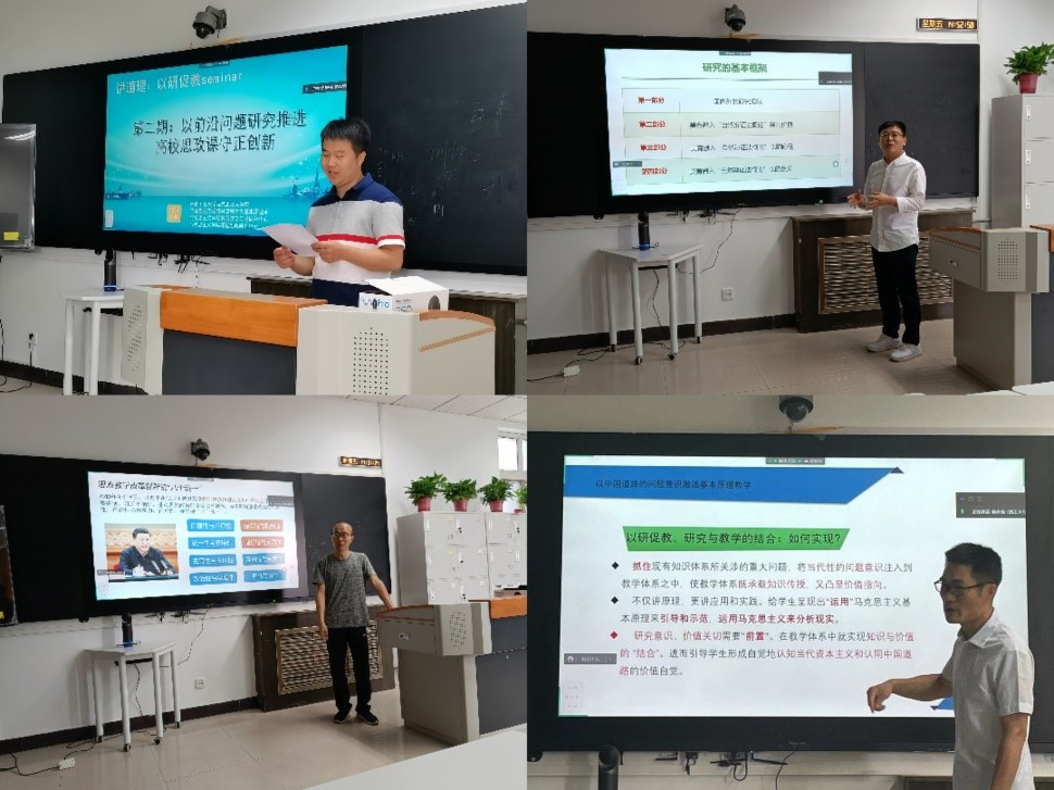 在“教研分享”环节,来自马克思主义基本原理系的四位青年教师结合自身教学与科研经历,以及5月13日—15日在中国延安干部学院的研学感悟,集中分享了对“以前沿问题研究推进高校思政课守正创新”的理解。聂阳副教授立足对数字资本主义、全人类共同价值等问题的研究,阐述了以中国道路的问题意识激活基本原理教学的必要性、可行性和具体的方式方法。吴鑫助理教授根据习近平总书记在学校思想政治理论课教师座谈会上的重要讲话精神,辨析了马原理教学中“建设性与批判性”、“实践性与理论性”相统一的问题。齐承水助理教授创新性地探析了新时代美育融入“自然辩证法概论”课的价值与路径,在注重“真”与“善”的同时,将“美”的理念和维度带入科技哲学的讨论之中。杨永强助理教授从空间政治学的视角出发,阐释了大变局时代资本主义全球政治规划的狡计,以及人类命运共同体理念的超越性,分析了在原理课教学中融入前沿问题研究的方式。