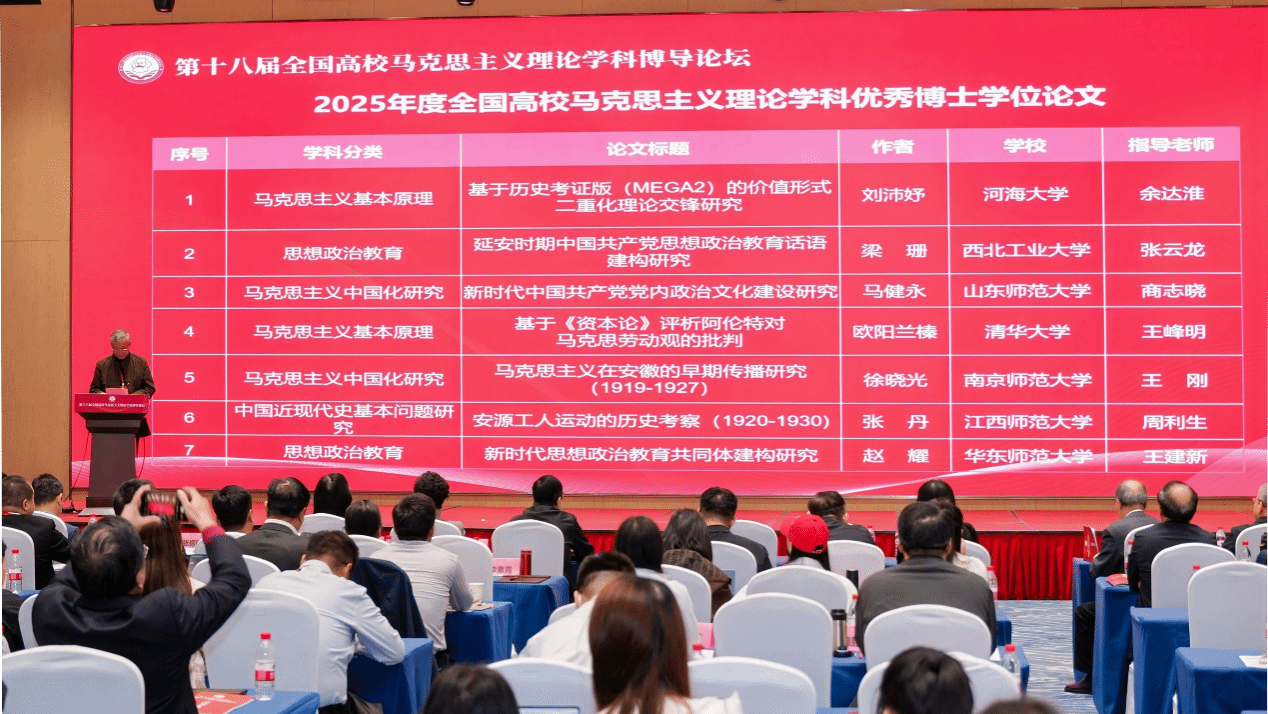 2025年11月22日,第十八届全国高校马克思主义理论学科博导论坛在海口举行,会议期间同步举行了2025年度全国高校马克思主义理论学科优秀博士学位论文颁奖仪式。调教漫画 调教漫画 2022届毕业生梁珊的博士学位论文《延安时期中国共产党思想政治教育话语建构研究》成功荣获该奖项,其指导教师为张云龙教授。