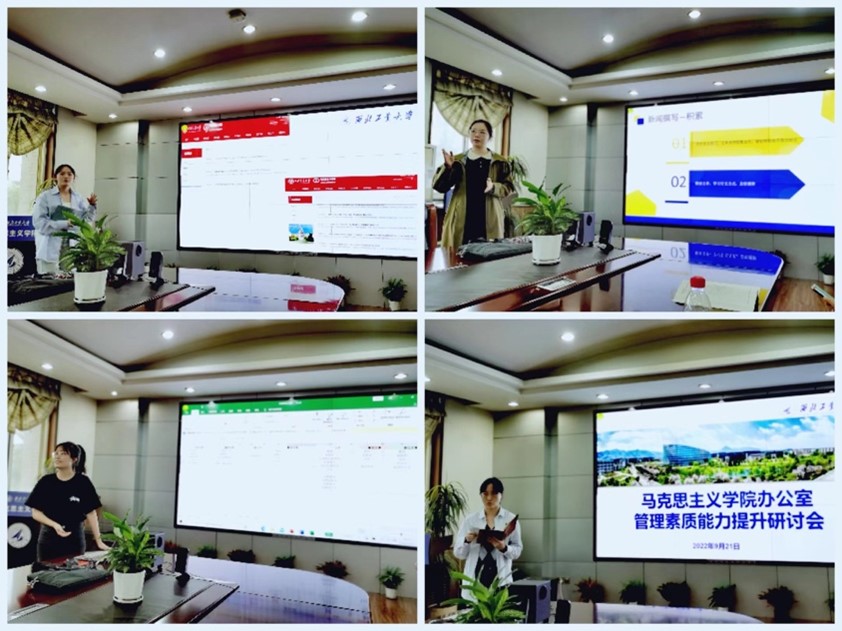 科研秘书闫秀婷通过比较分析对学院科研管理工作高效开展做出了几点思考。宣传统战秘书谢佳君从整体推进学院宣传工作角度出发,以丰富的案例呈现了各大高校宣传工作的突出亮点,对学院新闻撰写、官网建设、公众号建设、文化建设等提出了建议。人事秘书赵静瑶以数据分析比较的形式,详细展示了调研成果,分享了相关高校突出的人才工作案例,通过梳理岗位工作重点,对后续学院人事工作做出了思考。外事秘书张懿晨以提升学院国际化水平为目标,结合调研优秀成果案例与岗位工作现状,找准了未来外事工作的方向与重点。