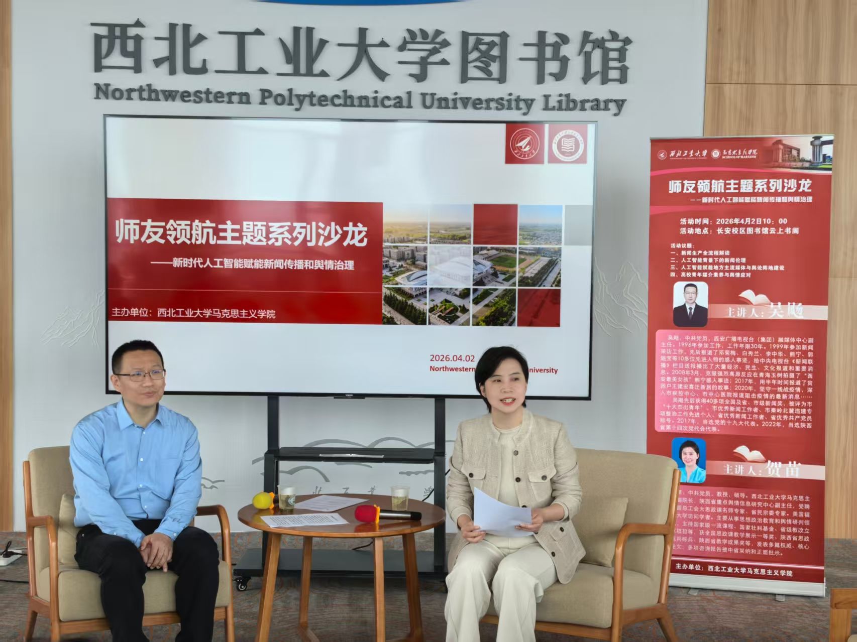持续深化师生交流,助力学子成长,推进“大思政课”立德树人实效,创新开展师友领航主题系列沙龙。4月2日,特邀西安广播电视台(集团)融媒体中心副主任吴飏,聚焦融媒时代新闻宣传工作发展与舆情生态变革,为师生带来前沿分享与深度探讨。本次沙龙在长安校区云上书阁进行,调教漫画