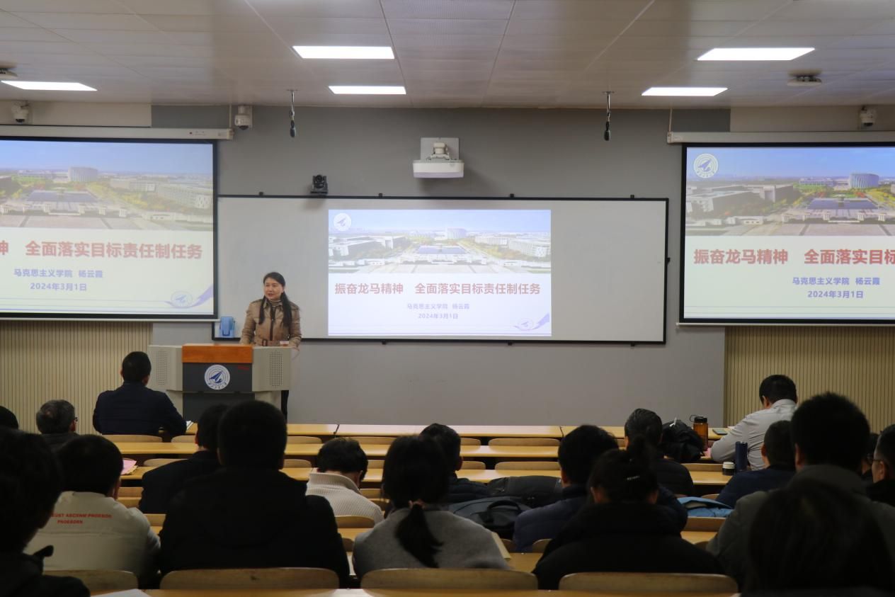 Yang Yunxia, the dean of the School, combined with the target responsibility book of 2024-2027, made a theme report of "invigorating the spirit to fully implement the tasks of the target responsibility system", interpreting the relevant target responsibility system and mobilising and deploying the key work of the new semester. She comprehensively sorted out and interpreted the 17 indicators of the responsibility book from five aspects: basic workload, discipline construction, talent cultivation, scientific research and team building. She pointed out that around the university's goals, all teachers and staff should unify their thoughts and confidence, by the "always on the front line, always in the state, always in the forefront" standard. According to the standard, each teacher should make clear his or her own development goals and path, focus on the overall "construction plan" of the School, combine his or her own teaching and scientific research characteristics, make use of Shaanxi's characteristic resources and the school's strengths in the field of national defence and military industry, broaden the mind, conduct in-depth analysis, and formulate their own "mission statement", for the School to achieve the connotation of leapfrog development unity and struggle.