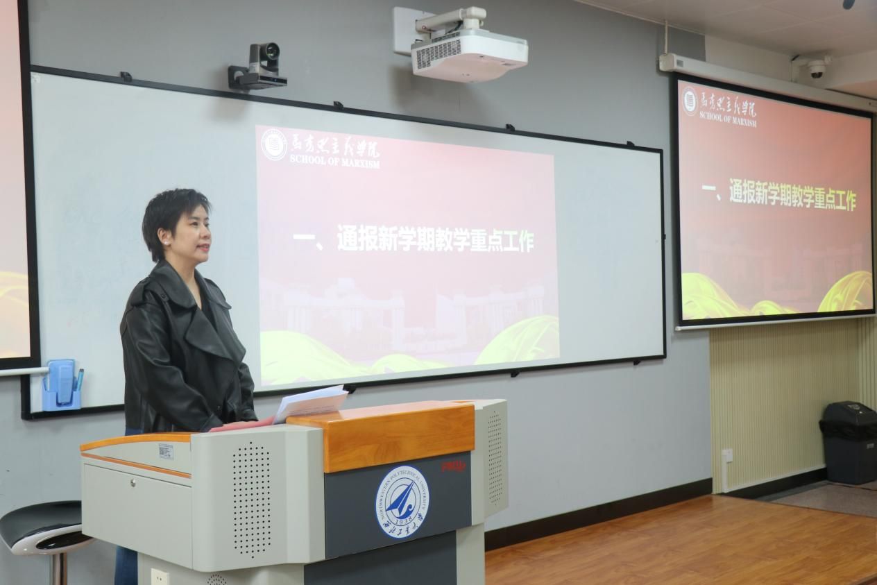 At the meeting, He Miao, the vice president, first informed the teaching focus of the new semester. She pointed out that in the new semester, all the faculty and staff should cooperate with the School to carry out the responsibility of the teaching part, actively undertake the teaching work of ideological and political courses under the premise of doing a good job in scientific research, and ensure high-quality teaching and cultivate a number of "high-quality" projects; continue to carry out the reform and innovation of ideological and political courses.