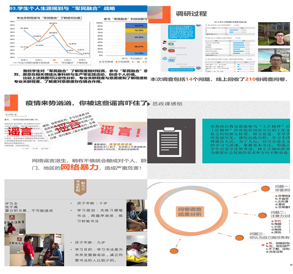 经过初评,在全校同学广泛参与的基础上,共有16个调研团队进入终评。各团队依次进行了成果展示,同学们的社会调查选题新颖,调研数据翔实、态度严谨,表达多样化,并将核心问题与思政课相联系得出结论。在前期调研的基础上,不少团队都结合当前疫情进行问题延申和新的探索,紧密围绕社情民情丰富了调研成果。谈到开展社会调查的体会,不少团队都谈到,这种实践十分必要且能够充分展示劳动教育在思政课中的意义,突出了学校思政课教学改革实践的育人实效。