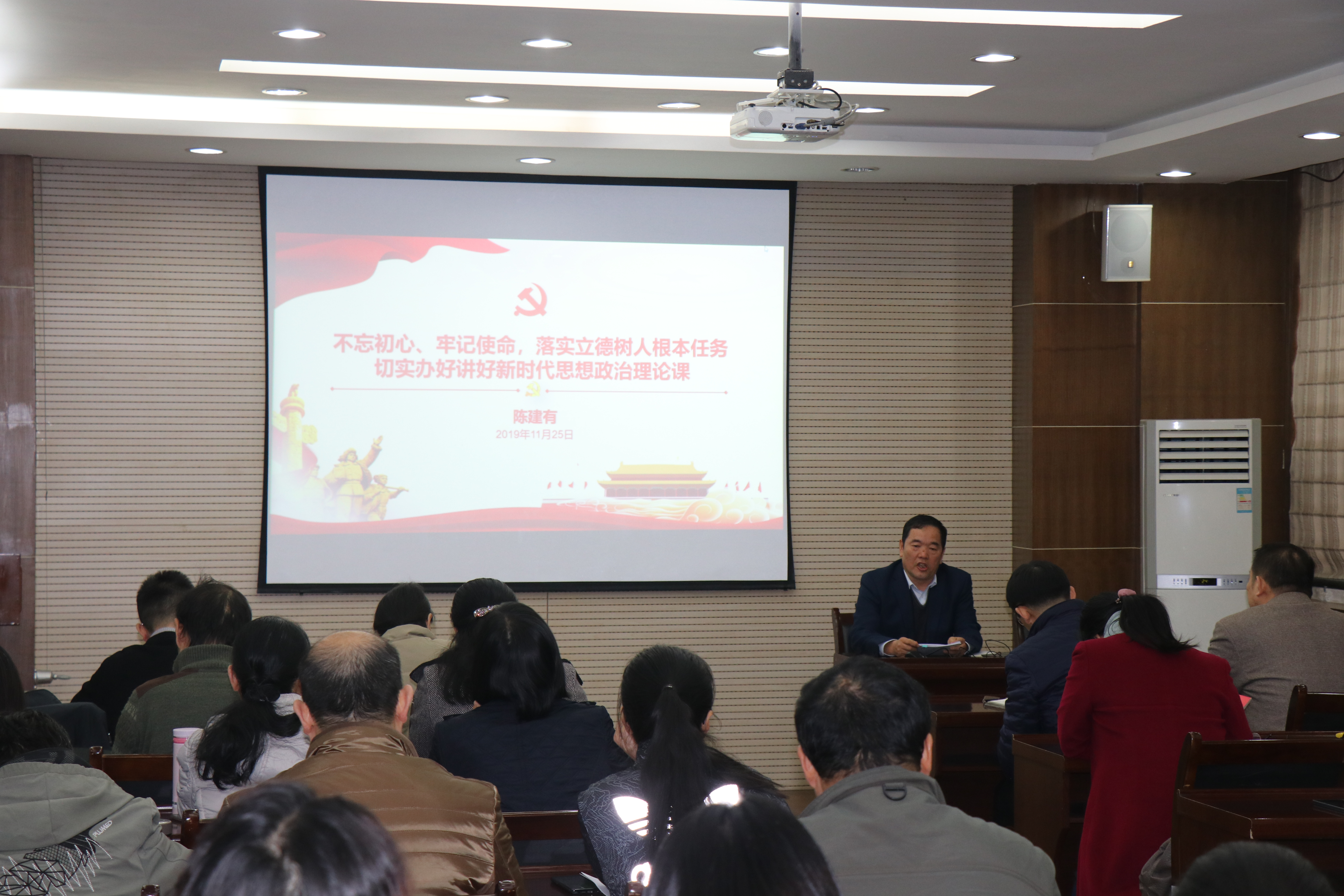 按照学校“不忘初心、牢记使命”主题教育部署安排,11月25日下午校党委副书记陈建有在调教漫画 305报告厅围绕“不忘初心、牢记使命,落实立德树人根本任务切实办好讲好新时代思想政治理论课”主题,面向调教漫画 全体教师作形势教育报告、讲授专题党课。