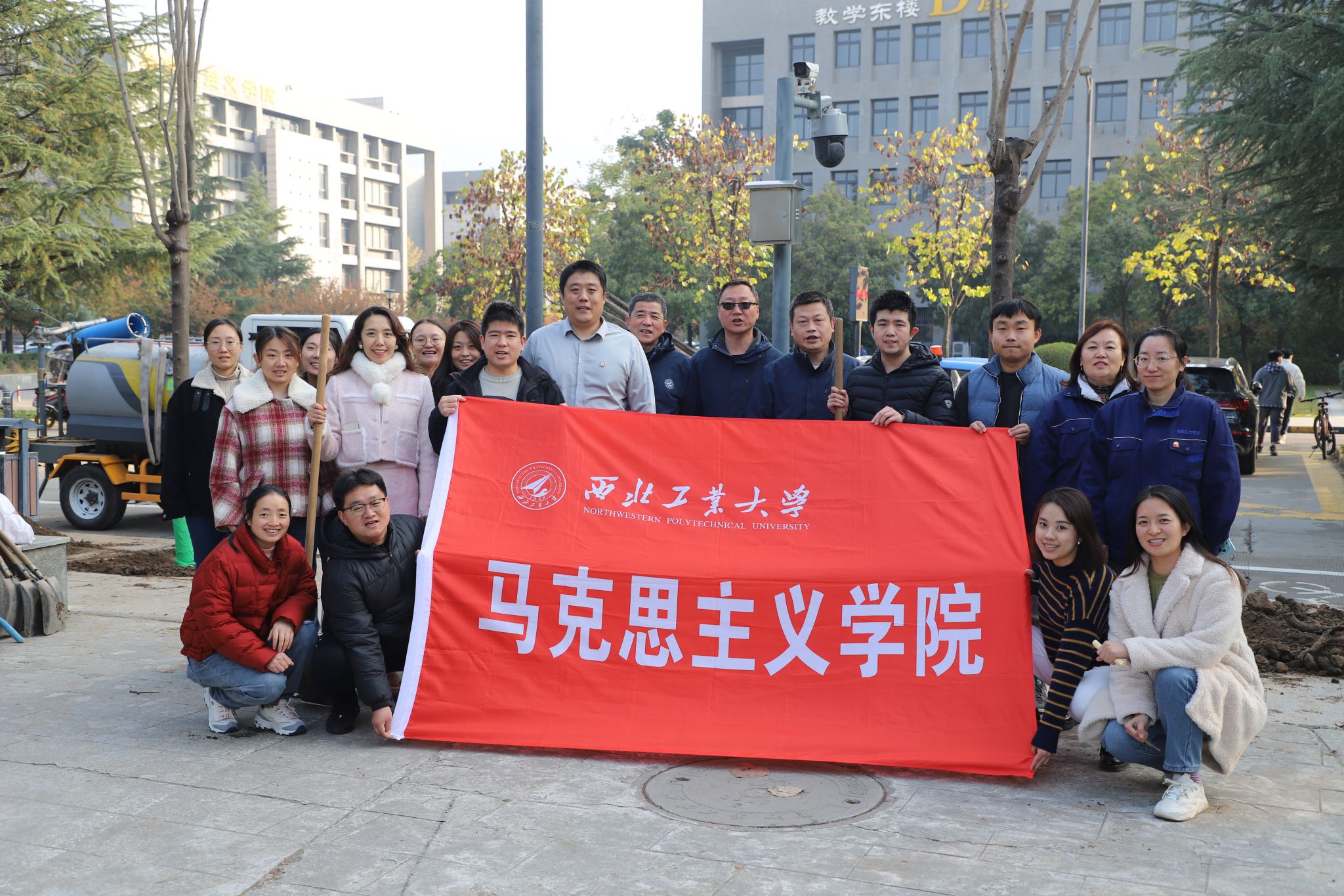 机关党支部、博士生第二党支部联合后勤产业集团物业服务中心党支部在长安校区校园内开展义务植树主题党日活动,学院众多师生党员也自发参与其中。