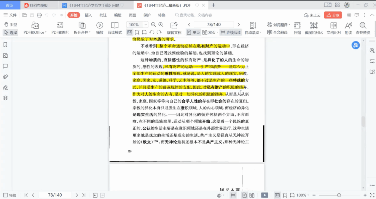 第一组由罗嘉阳同学就地租这一部分进行了汇报。聂阳老师就其中“社会是人同自然界完成了的本质的统一,是自然界的真正复活,是人的实现了的自然主义和自然界实现了的人道主义。”与同学们进行了探讨。首先,聂阳老师指出这里的“社会”更偏向于强调动态的发展过程,即社会化,与《提纲》中的“社会”有很大区别;这里的“社会”是指更高的境界,是人与自然界的统一,而非将社会与自然界对立起来的固化思维;这里的“社会”与共产主义是同义的,由此老师还引出了“社会主义”与“共产主义”的概念问题的流变,指出应当从当时的时代背景以及思想史的背景进行探讨。罗嘉阳同学认为马克思为了将自己同空想社会主义者区分开来,因此更多的使用“共产主义”一词。杨荣老师向同学们抛出了如何理解私有财产的扬弃中“扬弃”一词这一问题,指出这有助于我们理解当下社会主义市场经济中私有财产的存在。第一组的小麦同学提问到,为什么《手稿》的地位如此之高。齐承水老师指出这应当从莱茵报到手稿再到提纲的过程中探索,不能当成突变的、孤立的,这是“两个转变”中极其重要的一环。杨荣老师补充到,这是因为《手稿》中涉及到的主题较多,比如异化、扬弃、生态伦理、私有财产、共产主义、辩证法概论等,体现着青年马克思极强的迸发力。