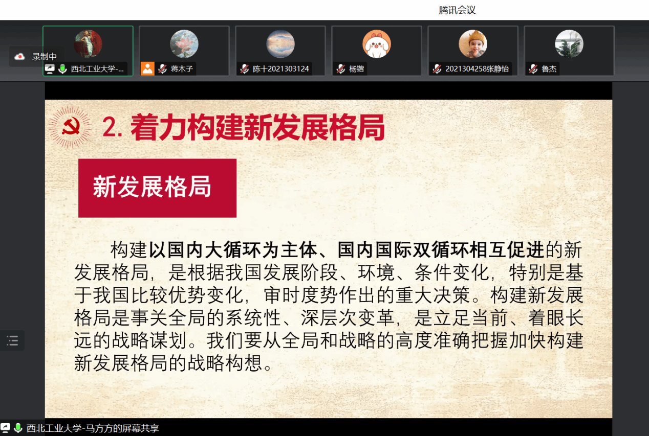 硕士生方译莹同学进行导读。她把内容分为四个部分进行阐释。第一部分,方译莹同学讲述了这一重要讲话的背景内容,习近平总书记提出新发展理念已有五年,各方面已形成高度共识,实践也在不断深化。第二部分是对文本内容从五个方面进行了全方位多维度的解释。第三部分,具体阐释了对构建新发展格局的深入研究,从重大意义、优势条件和制约因素、实践路径进行了讲述。最后一部分对文本内容进行了总结,要正确认识国际国内形势,全面把握新发展阶段,从全局和战略的高度准确把握加快构建新发展格局的战略构想,并要把握好几个重要着力点,提高党领导贯彻新发展理念、构建新发展格局的能力和水平。