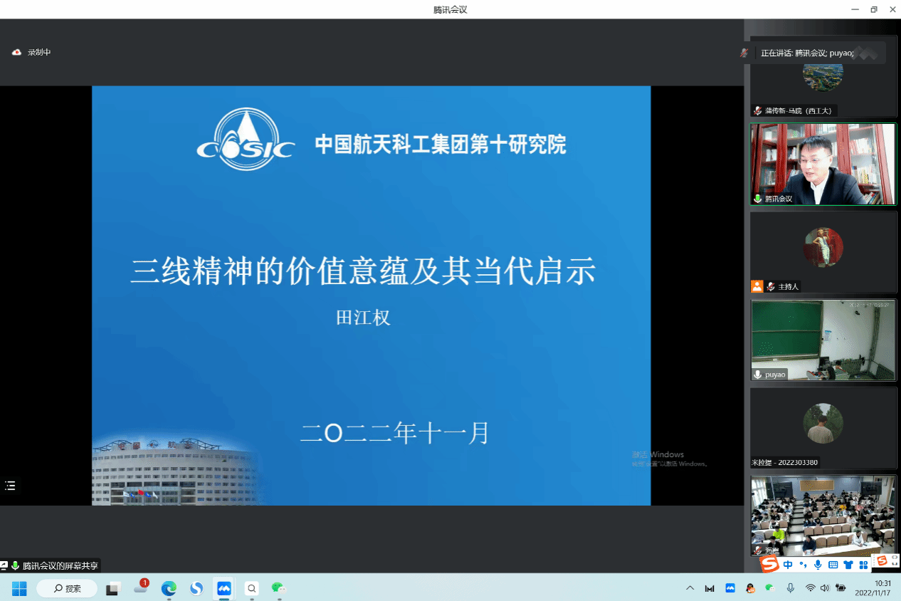 邀请到中国航天科工集团第十研究院田江权高级工程师做客翱翔名家讲堂,在云端开展《三线精神的价值意蕴及其当代价值》思政课程交流。本次活动由党委学生工作部主办、调教漫画