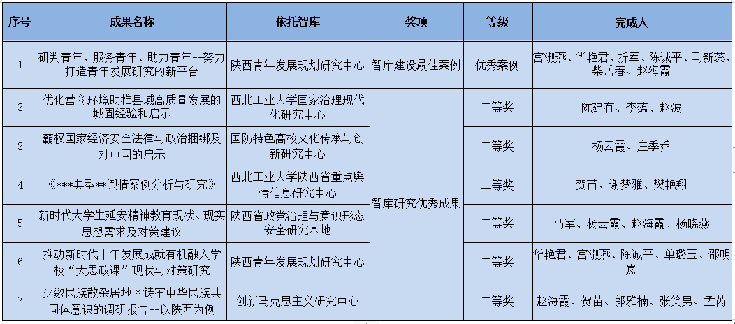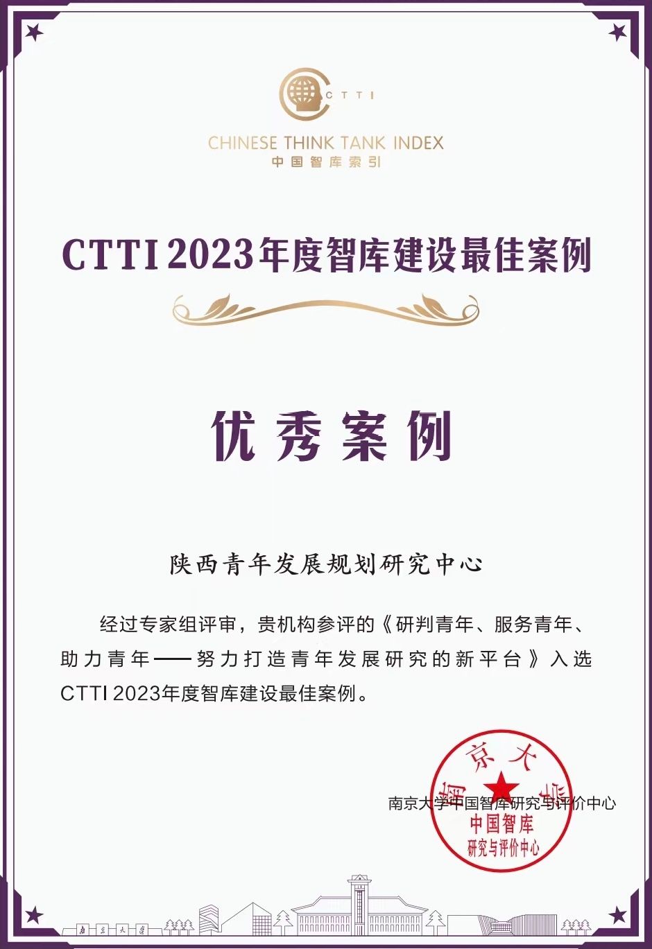 1项智库案例被评为优秀案例,六项智库成果获二等奖。《研判青年、服务青年、助力青年--努力打造青年发展研究的新平台》获得2023CITT智库建设优秀案例。《优化营商环境助推县域高质量发展的城固经验和启示》《霸权国家经济安全法律与政治捆绑及对中国的启示》《***典型**舆情案例分析与研究》《新时代大学生延安精神教育现状、现实思想需求及对策建议》《推动新时代十年发展成就有机融入学校“大思政课”现状与对策研究》《少数民族散杂居地区铸牢中华民族共同体意识的调研报告--以陕西为例》,均获得智库研究优秀成果二等奖。