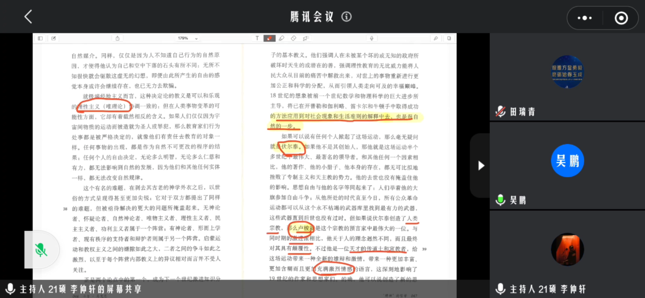 张云龙老师在阅读过程中,提到理性在启蒙运动中有重要的作用,吴鹏老师从启蒙的“敌人”入手,认为“私人和公共的矛盾中的非理性因素”就是封建、愚昧和宗教,通过教育改变人的观念实现启蒙,另外法国的唯物主义也谈论了自然环境(必然)对自由的限制问题。针对本书作者伯林的自由观,杨永强老师认为伯林继承了近代的自由主义观念,深受伏尔泰、卢梭等人的影响;马克思也追求自由,根本的不同就是马克思不认可通过私有制实现自由,张云龙老师补充了两种思想传统,伯林属于英美一派,有着消极自由的影子,同时他认为,对自由本质的认识是一个发展的过程,启蒙运动让人们增加了知识,也更容易形成民粹主义。吴鹏老师根据文本,谈到反思启蒙也是重要的论题,认为卢梭的思想包含着反思现代性的部分。此外,杨永强老师认为“历史主义”是德国的哲学传统,当时德国的政治领域是多元自由的,有独特的民族秉性。