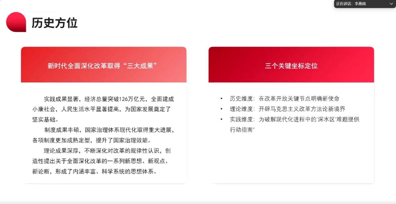 接着,博士生李燕南同学从历史方位、核心要义、科学方法和领导干部责任要求四个方面分享了对重要讲话内容的深入理解。并从实践层面、制度层面和理论层面深入梳理了全面深化改革以来所取得的一系列重大成就,详尽阐释了全面深化改革的重大意义。