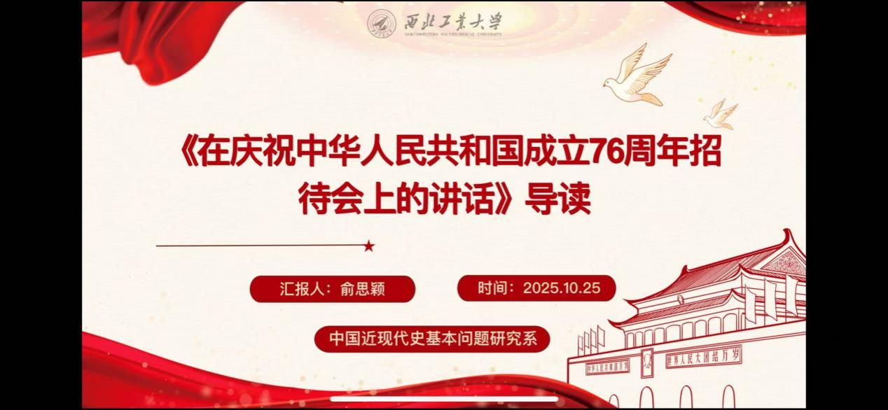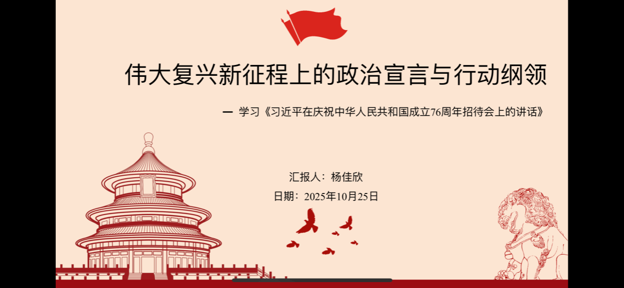 博士生杨佳欣同学在认真研读《习近平在庆祝中华人民共和国成立76周年招待会上的讲话》基础上从三个部分对其进行了解读。“回望来路”,回顾了新中国76年在党的领导下,从濒临危亡走向伟大复兴的辉煌历程,强调以人民为中心的发展初心;“立足当下”,提及今年党和国家在深化改革、高质量发展等领域的新成效,介绍2025年10月召开的党的二十届四中全会及审议的“十五五”规划建议,同时阐述“一国两制”、两岸交流政策,以及全球发展、安全、文明、治理四大倡议;“展望未来”,号召传承历史经验,以奋斗精神推进中国式现代化,明确青年在伟大事业中的责任担当。