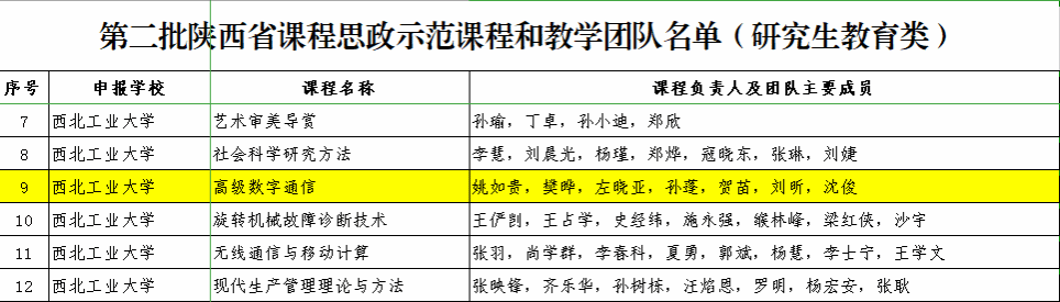 、航空学院、航天学院、航海学院、材料学院、机电学院、动力与能源学院、物理科学与技术学院、软件学院共同打造,极具西工大特色的一门公共选修课,是学校思政课程和课程思政同向同行的突破探索。学校教务处批准立项为文美通识课程。学院副院长贺苗参与的《高级数字通信》课程入选第二批陕西省课程思政示范课程和教学团队(研究生教育类)。
