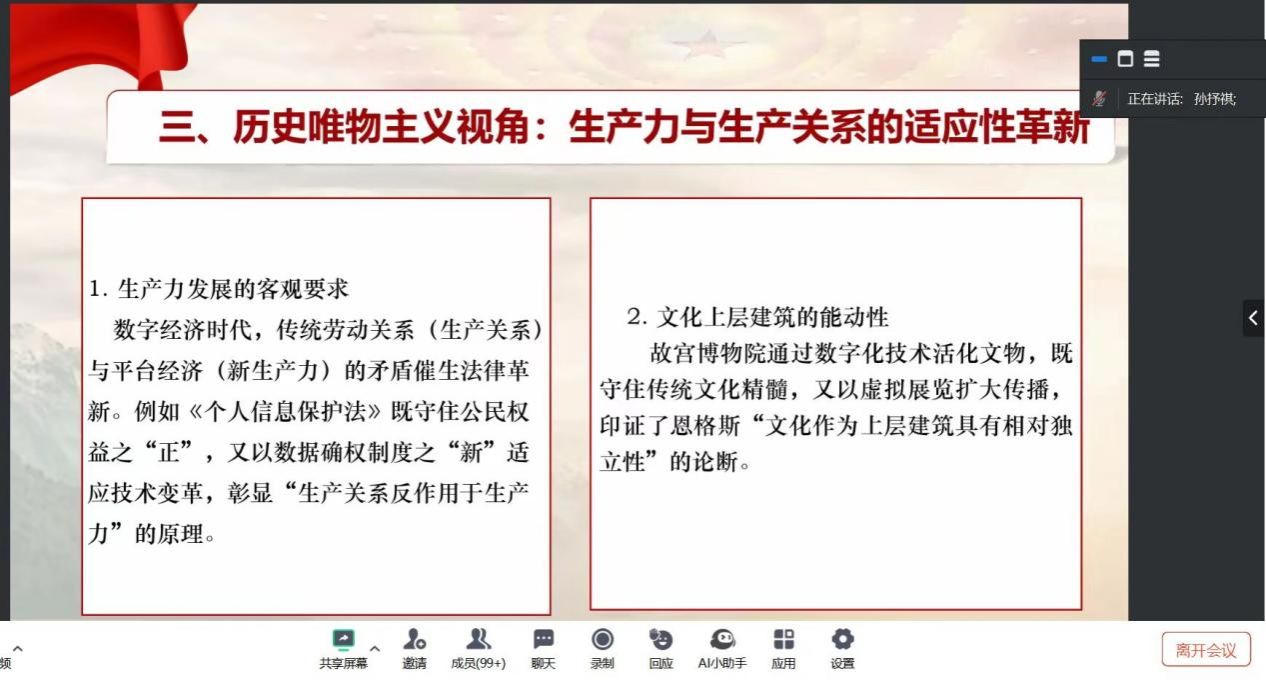 鲁杰思政课工作室主办,大连海事大学邵芳强教授作为对话教师,硕士生李红霞同学主持,中国高等教育学会马克思主义研究分会督导组成员尉迟庆文同学应邀参与,通过线上交流与线下讨论相结合的形式,为师生们搭建了一个思想交流、智慧碰撞的平台。