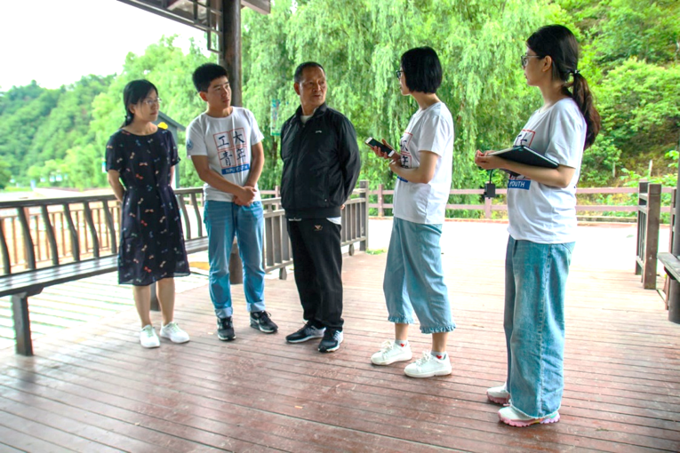 图为指导教师陈亚丽带领青马实践队队员与当地村民进行沟通交流